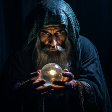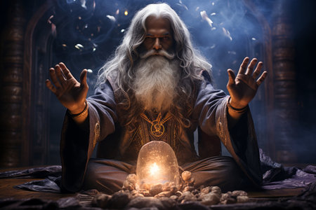 Elderly wizard magician astrologist in wide-brimmed hat gazes into a crystal ball, predicting the future amid a mystical, fairytale-like setting.