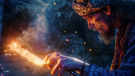 An old man, dressed in black, grips a smoking and glowing fire stick in his hand, concentrating with an aura of mysticism and magic in a photorealistic style
