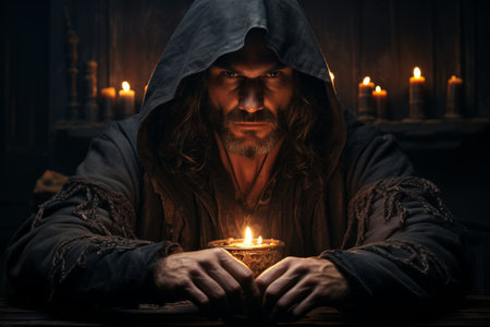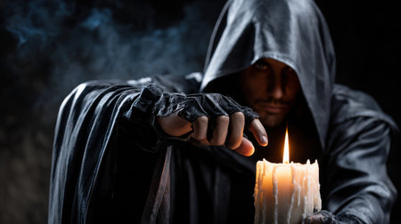 A man in a hooded robe is holding a candle. The image has a dark and mysterious mood, with the man's hooded cloak and the candle's light creating an eerie atmosphere