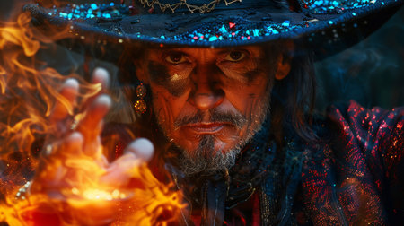 Atmospheric portrait of a man in vintage clothing holding glowing fire in his hand, surrounded by smoke and sparks, creating a mystical ambiance.