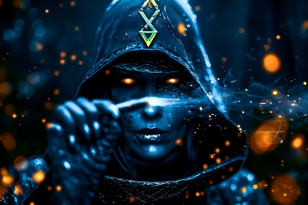 Enigmatic magician orbs and symbols glow mesmerizing eyes