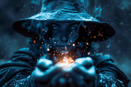 A cloaked figure stands in darkness, casting vibrant blue sparkles from their hands, embodying the enchanting spirit of Halloween festivities under the night sky.