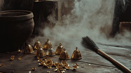 A captivating arrangement of vintage brass bells on a weathered wooden table, surrounded by mist and sparkling coins, evoking a sense of charm and nostalgia.