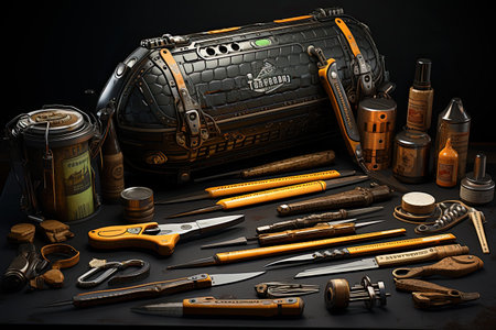 Assorted woodworking tools on dark surface with sparkling background. That the image is generated using AI.