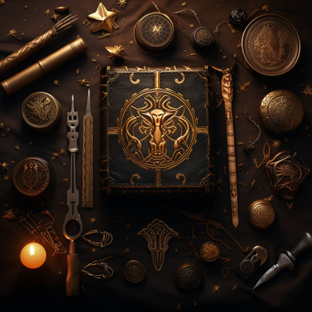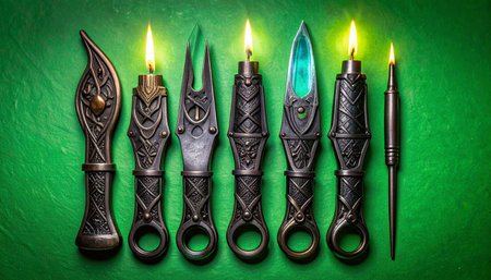 A collection of ancient, ornate ritual tools, each uniquely crafted and lit with a mystical flame.