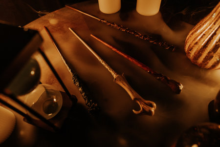 Ornate magic wands rest on a wooden desk, illuminated by glowing kerosene lamps, creating a mystical scene