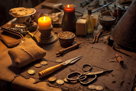 A wizard is holding a wand and standing in front of a table with many bottles and jars. The scene has a mystical and magical atmosphere with Generative AI