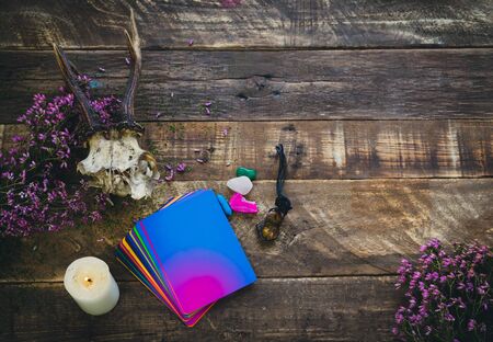 Table prepared for a tarot card reading. Mystery and futurology night.