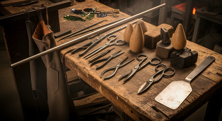 various glassblowing tools on workshop table, created with generative ai