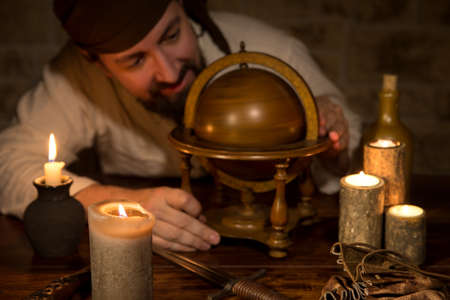 an explorer spinning an old globe, concept tourism and traveling