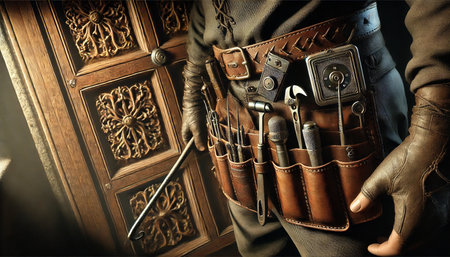 A man is wearing a leather belt with tools on it. The belt is brown and has a design on it. The man is standing in front of a wooden door