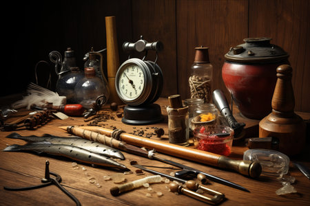 Explore an intricate arrangement of antique tools and accessories on a dark wooden table, perfect for creative projects and artistic inspiration.