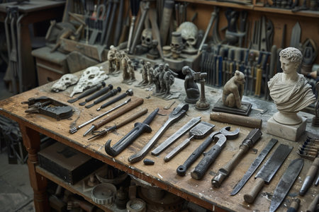 A collection of sculpture tools neatly arranged on a workbench. --ar 3:2 Job ID: ab5ca1fc-5e4b-49b6-835e-0f4a9b08c712