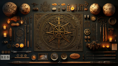 Mystic ritual and candles. Devil's board concept, black magic or fortune telling rite with occult and esoteric symbols. Mystical rituals and occult sciences.
