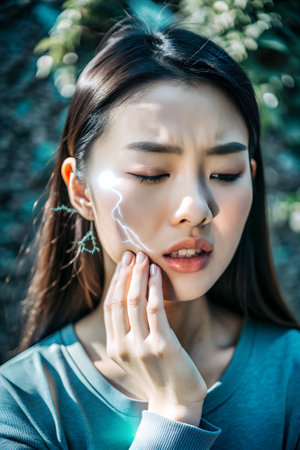 Beautiful Asian woman in the mood for a toothache A small lightning flash appeared on her cheek, like a tingling sensation in her teeth