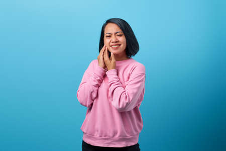 Portrait of young Asian woman touching cheek while suffering from terrible toothache