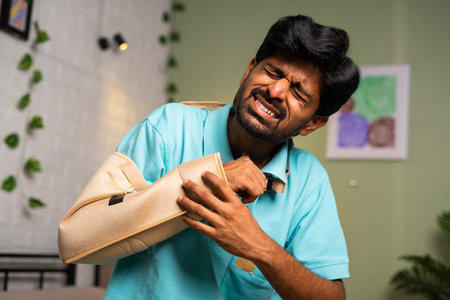 Medium shot of Young man suffering from broken or injured hand at home - concept of medical or health care treatment, injury and rehabilitation