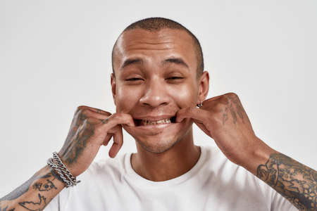 Portrait of funny mixed race tattooed guy looking at camera, forcing smile with fingers in his mouth while posing isolated over white background