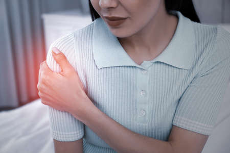 Woman suffering from shoulder pain at home, closeup