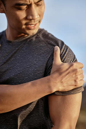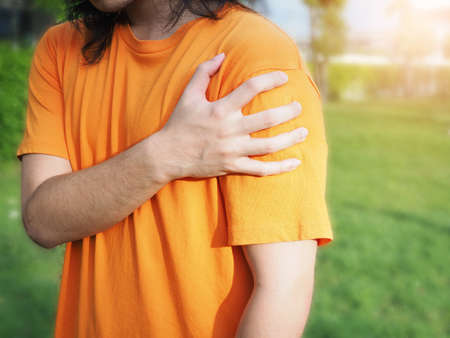 Young man with shoulder pain and muscle injury use hand massage on body to relieve