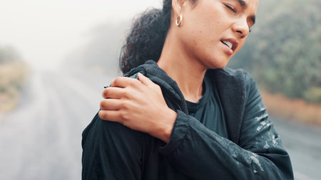 Outdoor, shoulder pain and woman with fitness, tension and accident with burnout or training. Female person, nature and runner with exercise, joint injury or frustrated athlete with muscle strain