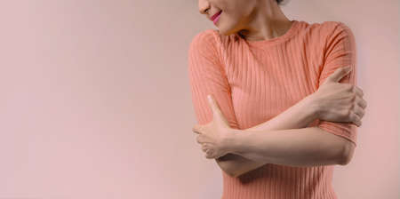 Love Yourself Concept. Smiling Female Embracing and Hugging Herself. Positive Mind. Wellbeing Mental Health. Single in Valentines Day
