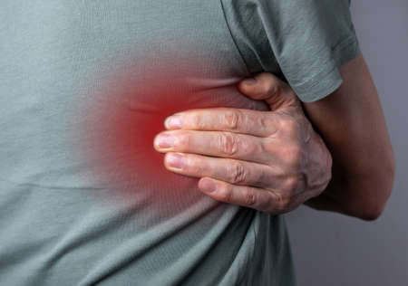 young man suffering pain in heart and holding chest with hand