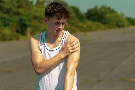 Athlete touching painful shoulder with red point during outdoor training. Dislocation, arthritis, fracture, rotator cuff strain consequences. Health problems in sport concept. High quality photo