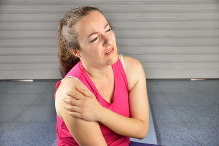 Woman with shoulder pain. Young woman with pain in shoulder. Suffering from pain in shoulder of woman.