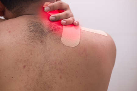Itching of skin diseases in man Uses hand to scratch the shoulder. Red around the Itching area. The concept with Healthcare And Medicine.