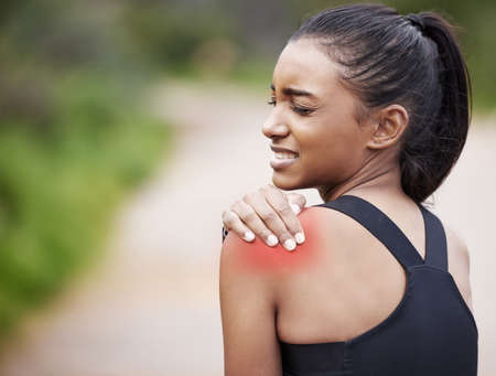This muscle feels so tight. Shot of a sporty young woman experiencing shoulder pain while exercising outdoors.