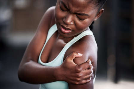 Stopped in her tracks by an injury. Cropped shot of a young woman holding her injured shoulder.