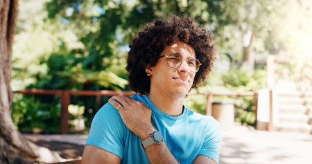 Fitness, man and shoulder pain of injury at park with tension, muscle cramp and ache discomfort from exercise. Nature, runner and workout accident with tender joint, inflammation and training mistake