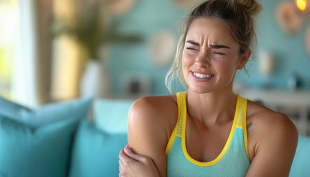Athletic woman touching her shoulder, grimacing in pain while sitting on a sofa at home