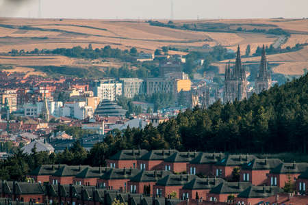 View of the Cathedral of Burgos and the city from the mountains and the field during the sunset