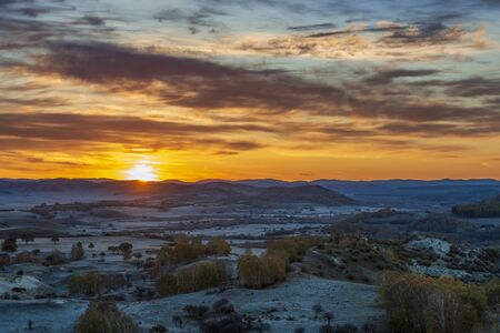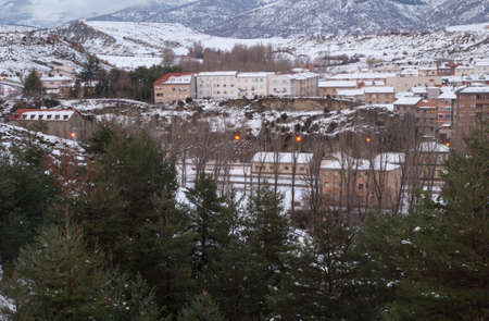 Hoyos del Espino at sunset. Avila town in Spain. In the background the peaks of the mountains belonging to the Sierra de Gredos to the south of the small town.