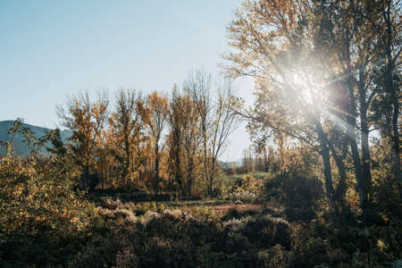 Poplar tree plantation in autumn, Rio Lobos Canyon in Soria, Spain