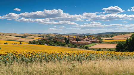 Vibrant sunflower fields stretch across the landscape, complementing a quaint village nestled amid green hills, all under a clear blue sky and puffy white clouds.