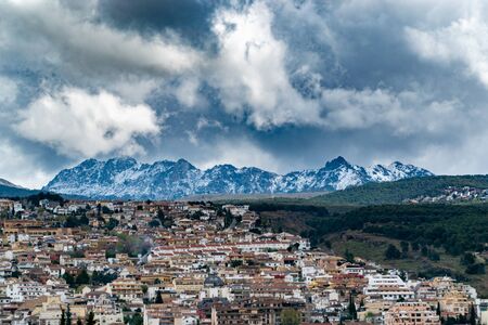 Snow clouds over a village in the snowy mountains of the Sierra Nevada of Spain. Beautiful Winter View Over a Snowy Mountain