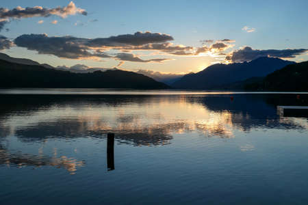 A sunset by Millstaetter lake in Austria. The lake is surrounded by high Alps. Calm surface of the lake reflecting the sunbeams. The sun sets behind the mountains. A bit of overcast. Natural beauty