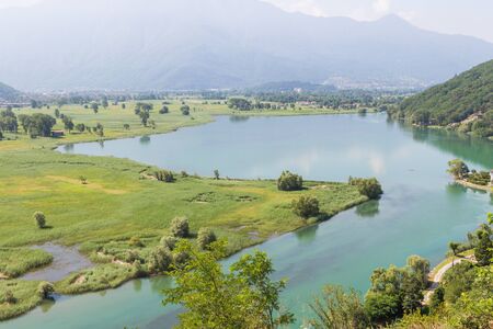 Lago di Mezzola Lake landscape. Water and mountains. Lombardy, Italy, Europe.