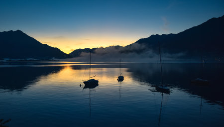 sunrise at Lake Mezzola in Northern Italy, scenic landscape with water, mountains and trees, boat in the foreground