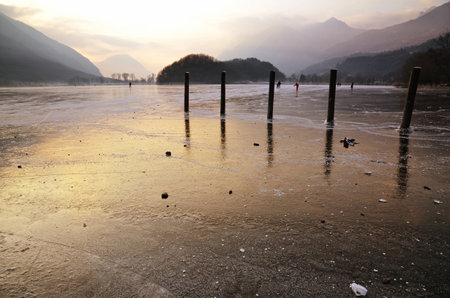 Lake Caldonazzo in Trentino during a spectacular sunset. Orange and blue colored sky in the evening.