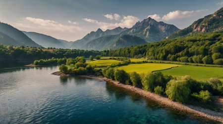A beautiful mountain range with a lake in the foreground. The lake is calm and the mountains are covered in trees. The sky is clear and the sun is shining brightly. The scene is peaceful and serene. Como Lake, Italy