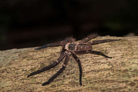 Top view on female Tarantula spider. Big hairy Arachnida on brown tree bark.