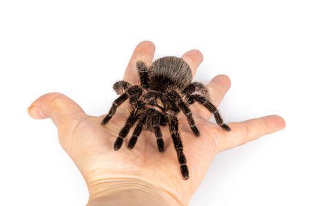 Top view of female adult Curly Hair Tarantula aka Tliltocatl albopilosus, standing on human hand. Isolated on a white background.