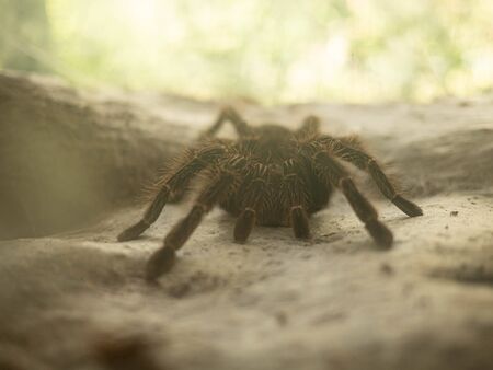 A closeup of a tarantula on the ground under the sunlight with a blurred background