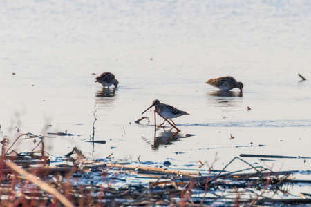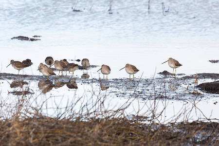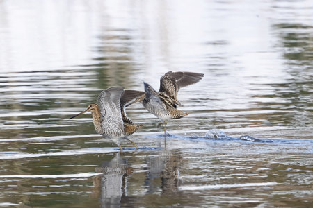 Common Snipe (Gallinago gallinago) group of birds in water