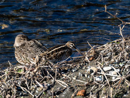 A common snipe, Gallinago gallinago, stands in the brush beside the Hikiji River in Yamato, Japan.