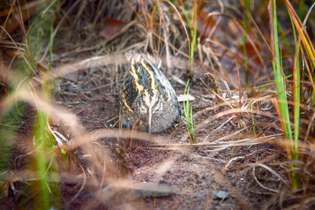 Jack snipe (Lymnocryptes minimus) - very secretive marsh fowl. Bird is hiding and sees equally well forward and backward